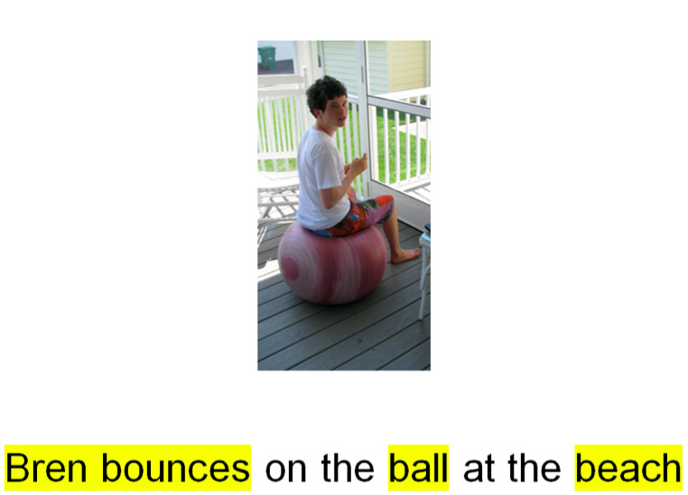 - At this stage, Bren is reading all of the main content words in the sentence “Bren bounces on the ball at the beach”. The instructor helps by reading the small connecting words - “on, at, the”.